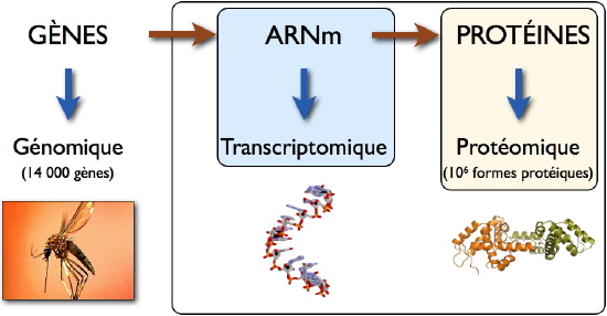 La Transcriptomique et la Protéomique dénomment l’ensemble des méthodes permettant d’étudier à large échelle les ARNm et les protéines, respectivement. Alors que les méthodes d’analyse transcriptomique ont atteint une robustesse et un débit élevés, la protéomique demeure un domaine en évolution permanente. En effet, la diversité chimique des protéines, associée à l’ensemble des modifications dont elles peuvent être l’objet (clivage, oxydation, méthylation, phosphorylation, etc), représentent un défi technologique considérable pour les chercheurs. Ainsi, d’après le «