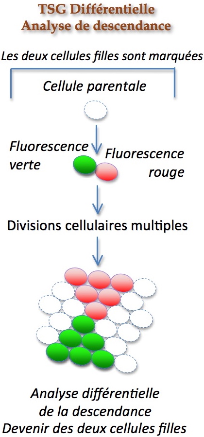 TSG génère après la recombinaison mitotique deux « twin spots », ou cellules filles, rendues visibles et distinguables dans les tissus internes grâce à la fluorescence verte et rouge permettant une analyse différentielle de leur devenir. Précédemment une seule cellule pouvait être marquée [3].