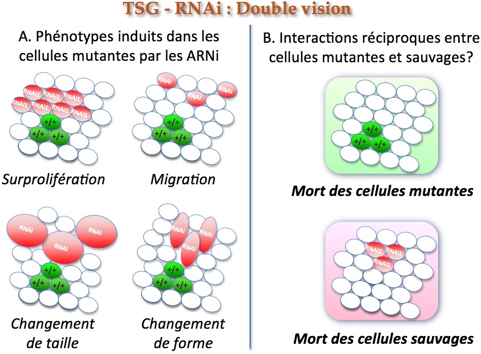 régulation réciproque par échange d'informations entre cellules mutantes et normales (Figure 4B). Par exemple, il est possible qu'une mutation RNAi n'induisant aucun phénotype particulier dans les cellules qui la porte, puisse affecter la viabilité des cellules sœurs sauvages qui l'environnant. Un tel phénomène serait resté invisible dans les criblages précédents menés avec un seul marqueur.