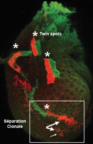 Les astérisques marquent différent « twin spots » dans un tissu progéniteur de la patte de la mouche. Le rectangle entoure une région spécifique où les cellules de même origine (en rouge) se sont séparées par perte de cohésion. Ce comportement est spécifique à ce tissu.