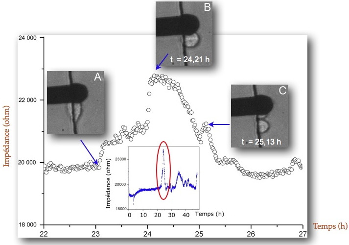 [2]. Le caractère pluridisciplinaire du laboratoire Biopuces a permis à ces chercheurs d'observer clairement un pic d’impédance associé à la