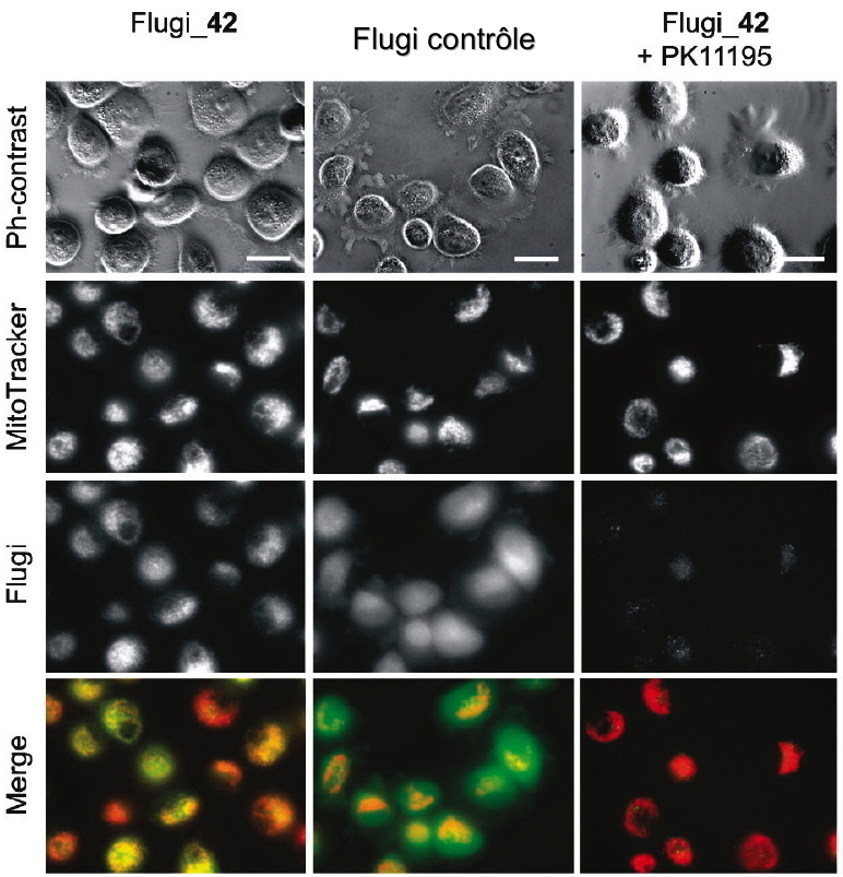 drug-like » peuvent être une source de sondes en bio-imagerie. Des applications différentes des Flugis pourraient être envisagées et un criblage des banques fluorescentes pourrait être combiné à une analyse d’image à haut contenu pour identifier des bio-marqueurs spécifiques d’états ou de pathologies cellulaires.