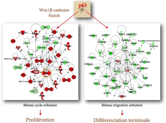 Ce travail permet l’émergence d’une vision générale des « effecteurs » qui agissent en aval de p63 pour réguler la prolifération ou enclencher la différenciation terminale des kératinocytes. Les variations d’expression entre ces deux réseaux génétiques et leur équilibre contrôlent
