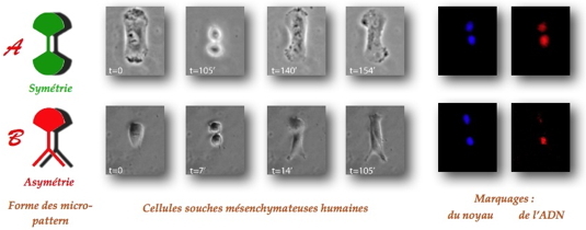 cellules souches mésenchymateuses dans des environnements symétriques ou asymétriques. Puis, dans chacune de ces conditions, ils ont étudié la division cellulaire en observant la distribution des brins d’ADN des chromosomes d’une cellule mère entre ses deux cellules filles. En effet, dans une cellule, chaque chromosome est composé d’un brin d’origine et d’un brin copie (issu de la réplication du brin d’origine). Au cours de la division, les deux brins d’ADN sont répliqués, séparés puis répartis entre les deux cellules filles. Les chercheurs ont montré que dans les cellules souches confinées dans un environnement symétrique, les deux types de brin d’ADN sont répartis équitablement entre les deux cellules filles. Par contre, dans le cas de cellules souches confinées dans un environnement asymétrique, le brin d’ADN d’origine va se concentrer dans une des cellules filles et le brin d’ADN copie dans l’autre cellule fille. Cette répartition inégale des brins d’ADN entre les cellules filles est déterminante pour leur avenir. En effet, la cellule fille ayant hérité des brins d’origine restera souche alors que sa sœur se différenciera et se spécialisera en un autre type cellulaire.