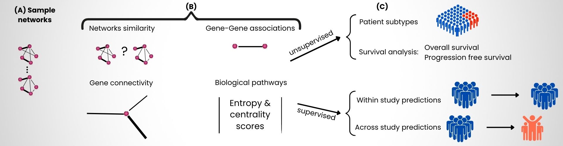 We constructed gene co-expression networks and analyzed their topological properties to assess their utility in predicting therapeutic response in renal cancer patients. Based on a cohort of over 300 renal tumor transcriptomes, we generated patient-specific gene networks (Figure, panel A) and evaluated their connectivity, gene-gene associations, network similarity, and pathway deregulation (Figure, panel B). This analysis uncovered gene co-expression signatures and enhanced the predictive performance of machine learning models for immunotherapy response (Figure, panel C).